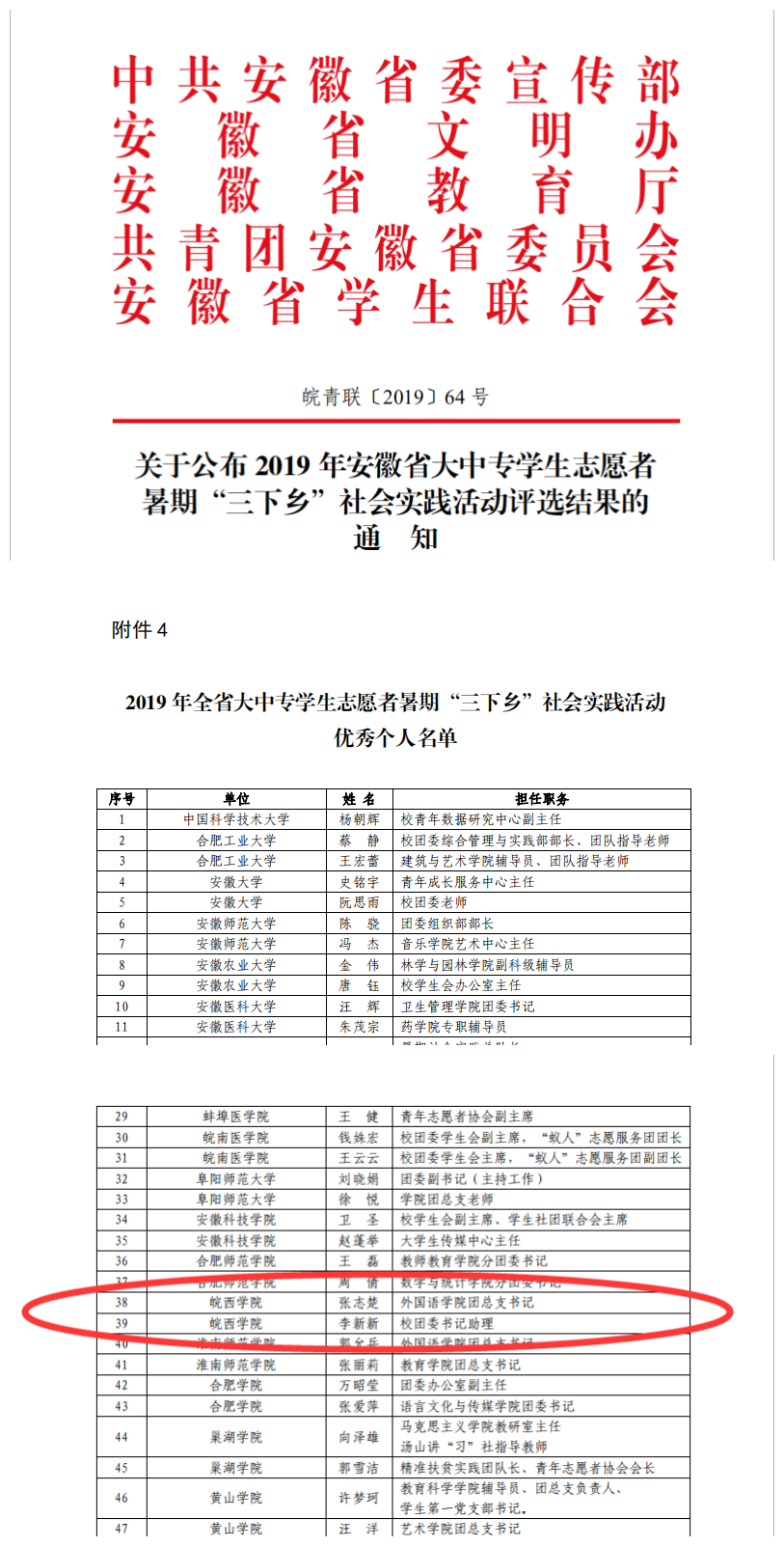 12月17日,省委宣传部、省文明办、省教育厅、团省委、省学联联合印发《开云足球公布 2019 年安徽省大中专学生志愿者暑期“三下乡”社会实践活动评选结果的通知》,开云足球团总支负责人张志楚获评“优秀个人”。