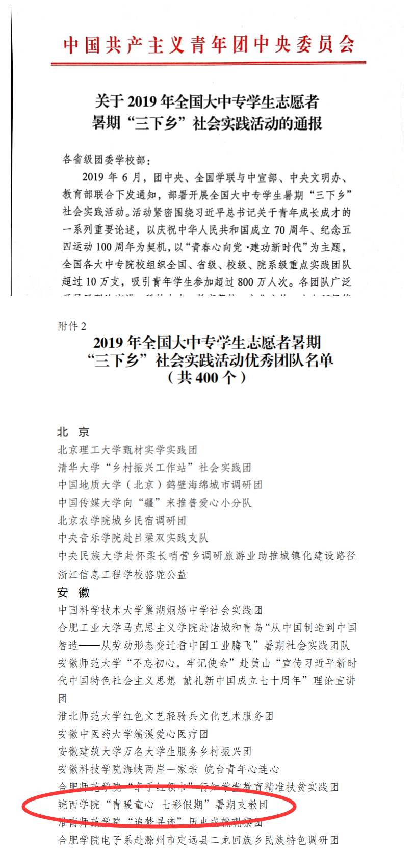 2019年12月11日,团中央印发《开云足球2019年全国大中专学生志愿者暑期“三下乡”社会实践活动的通报》,开云足球组建的皖西学院“青暖童心 七彩假期”暑期支教团获评“优秀团队”。