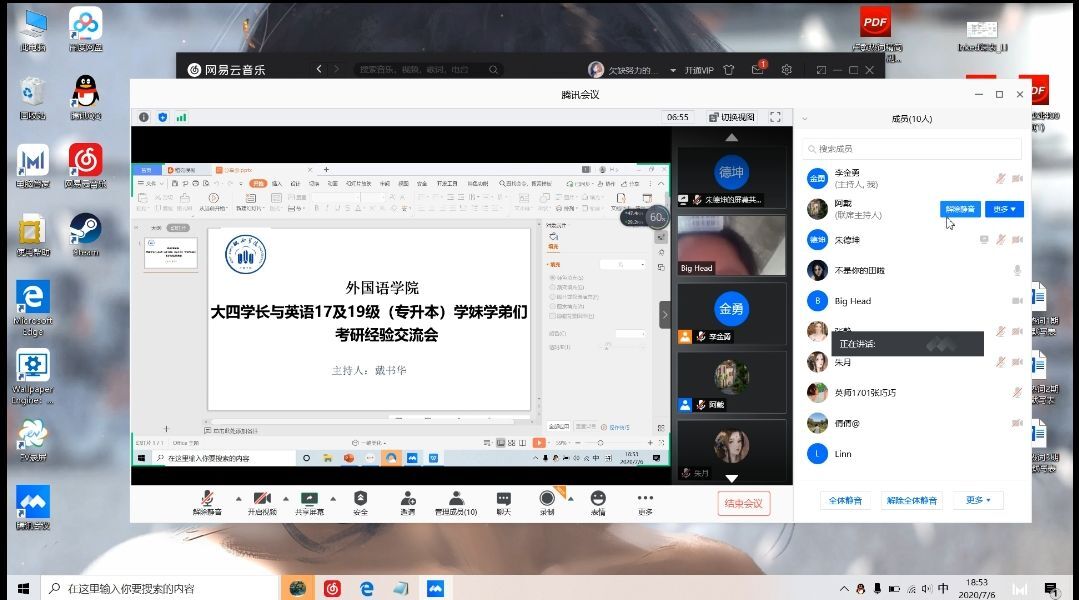 2020年7月6日下午7时,开云足球于腾讯会议开展线上考研经验交流会,参与人数达150余人。
