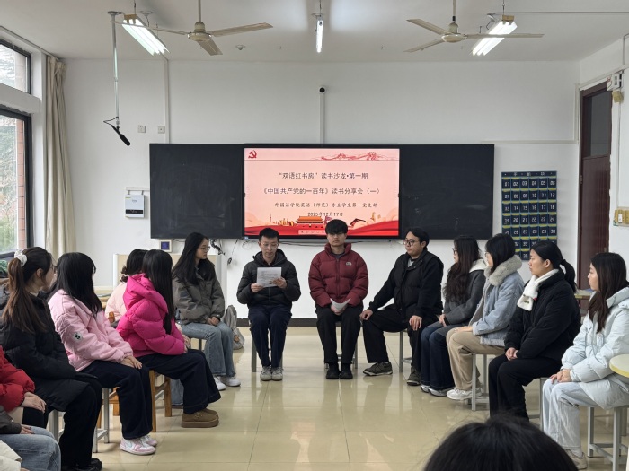12月17日午间,外语楼1406教室暖阳洒落,外国语言与国际传播学院英语(师范)专业学生第一党支部近30名党员、预备党员及积极分子齐聚于此,以《中国共产党的一百年》汉英版为核心读本的首期“双语红书房”读书沙龙正式启动。