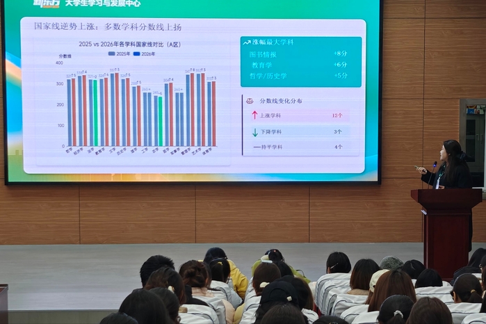 讲座伊始,郝老师以《2027中国大学生考研白皮书》为依据,深入分析了当前考研形势。她通过翔实的招生数据,梳理近年来考研报名人数与录取比例的变化趋势,引导同学们理性看待“考研热”。针对普遍关注的“择校择专”问题,郝老师指出“选择大于努力”的重要性,并分享如何结合个人实力与专业背景进行科学定位的实用方法。